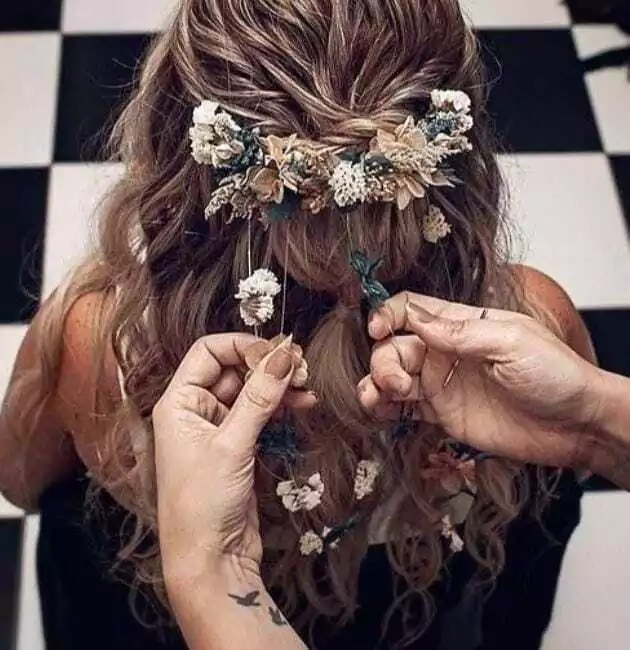 Las flores que usamos son preservadas y secas. La gran ventaja de este tipo de accesorio es que dura toda la vida si se lo cuida bien. En el caso de novias, comuniones, cortejos y cumpleaños, son ideales ya que se pueden tener con anticipación y llevarlos a las pruebas de vestido, peinado y maquillaje.