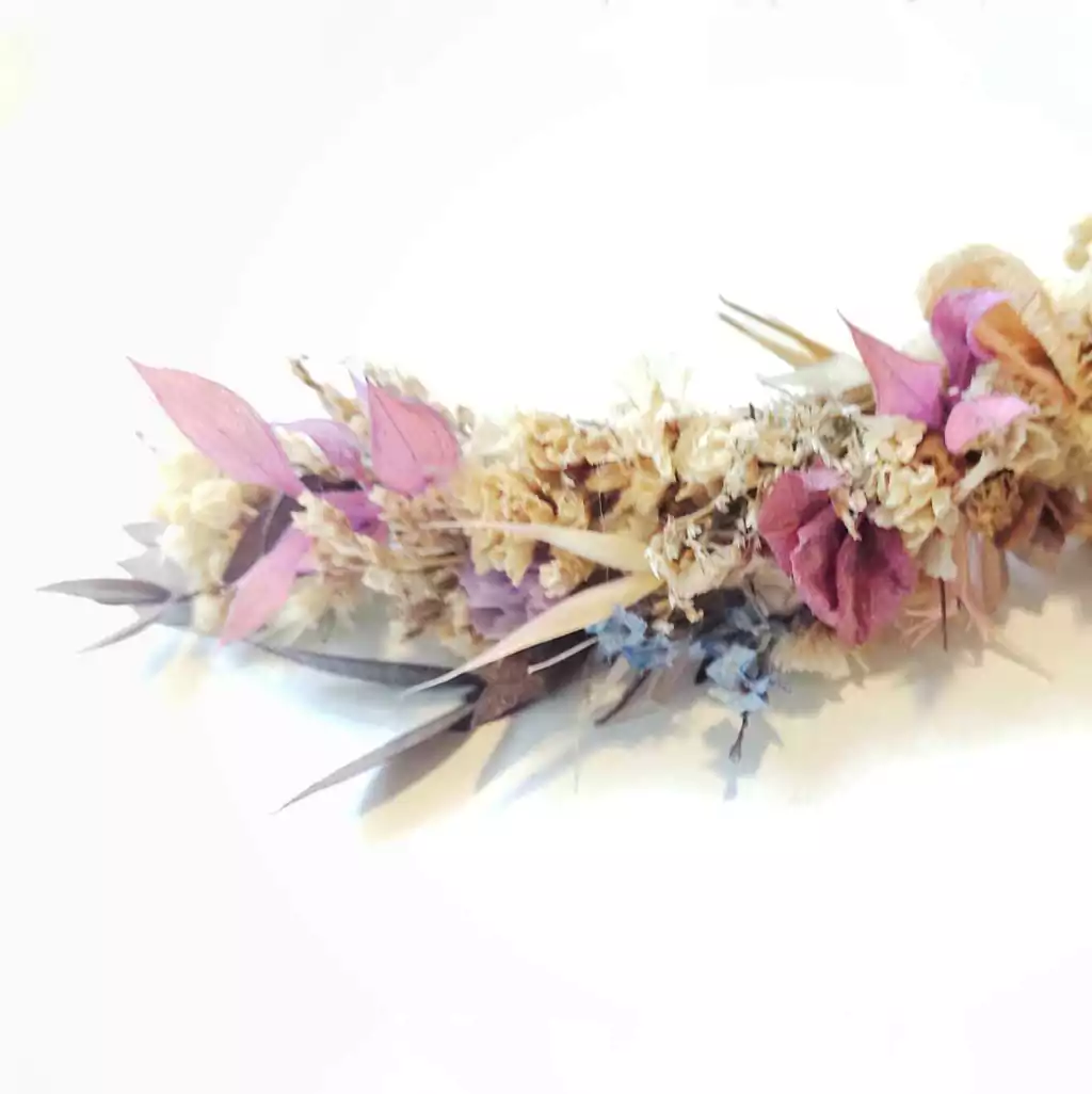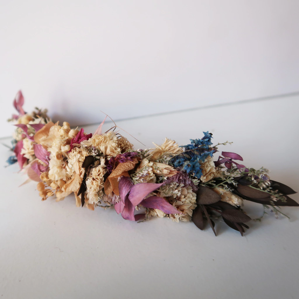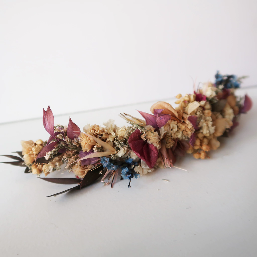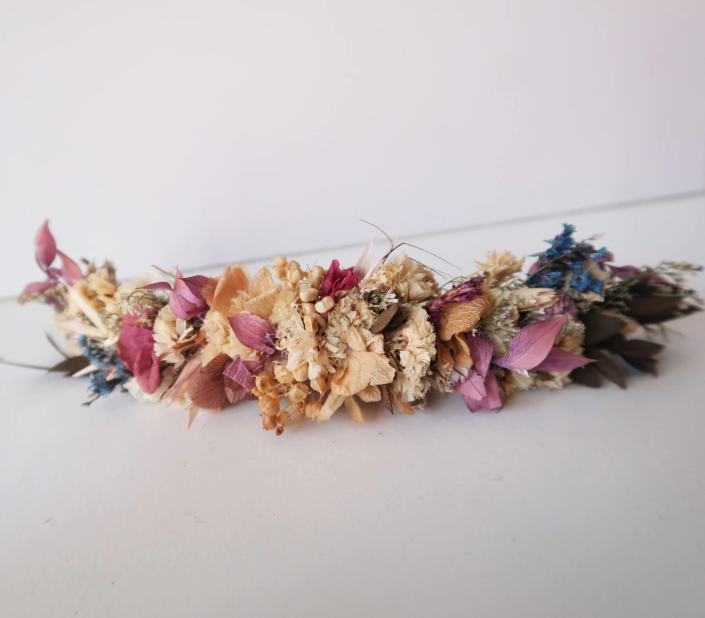 Tocado de flores naturales secas y preservadas. El tamaño es de 19cm de largo, por 3cm de alto.