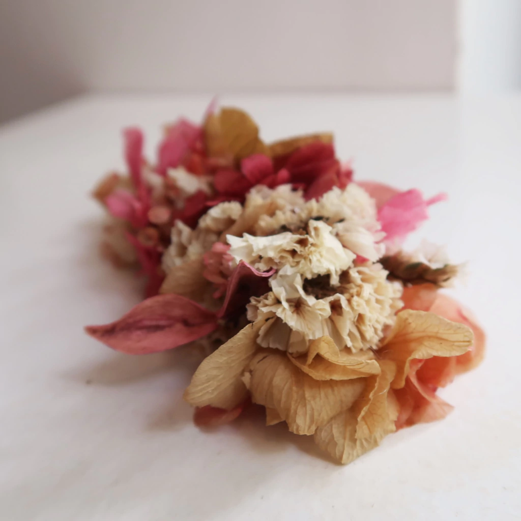 Tocado de flores naturales secas y preservadas. El tamaño es de 10cm de largo, por 3.5cm de alto.