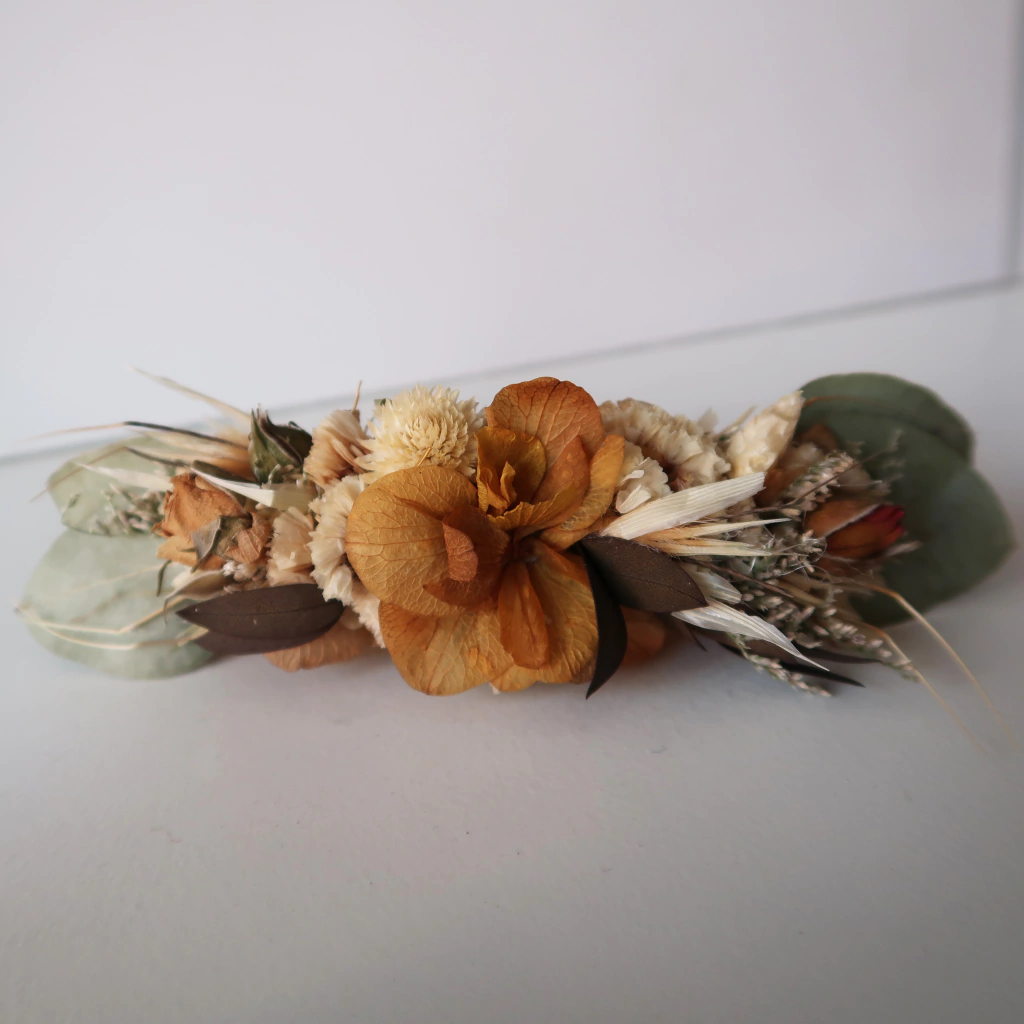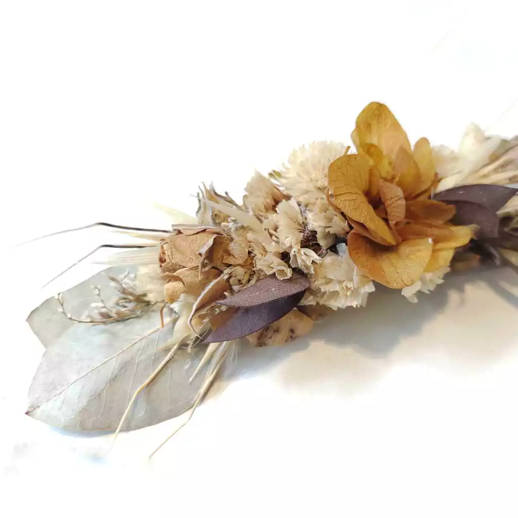 Tocado de flores naturales secas y preservadas. El tamaño es de 14cm de largo, por 3cm de alto.